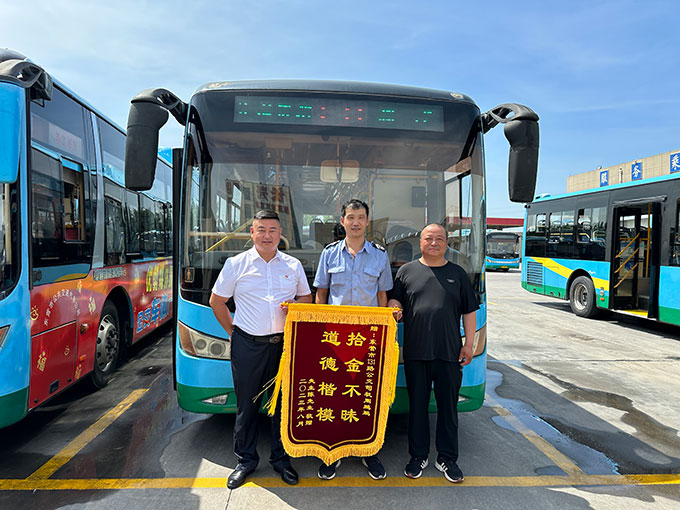 8月1日,陳先生將一面寫(xiě)有“拾金不昧,道德楷模”的錦旗送到市公交集團(tuán)汽車(chē)六隊(duì),感謝131路駕駛員周鵬鵬師傅拾金不昧。