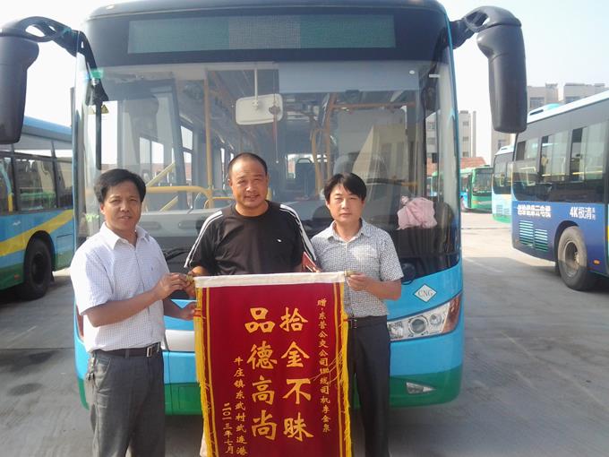 2013年7月29日,東營區牛莊鎮東武村的武連港師傅為公交車駕駛員李金泉送來了一面“拾金不昧、品德高尚”的錦旗表示感謝。