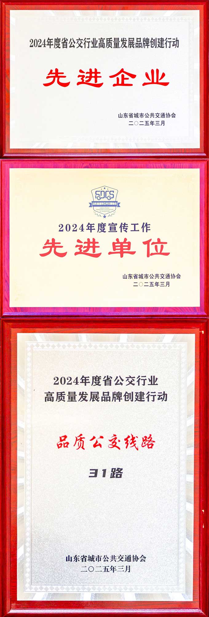 會(huì)上,東營(yíng)市公交集團(tuán)獲得2024年度全省公交行業(yè)宣傳工作先進(jìn)單位、全省公交行業(yè)高質(zhì)量發(fā)展品牌創(chuàng)建行動(dòng)先進(jìn)企業(yè)等榮譽(yù)稱號(hào),汽車三隊(duì)31路公交線路被評(píng)為2024年度全省公交行業(yè)高質(zhì)量發(fā)展品牌創(chuàng)建行動(dòng)“品質(zhì)公交線路”稱號(hào),李衛(wèi)校、高新杰、劉忠華等3名同志被評(píng)為全省公交行業(yè)高質(zhì)量發(fā)展品牌創(chuàng)建行動(dòng)“誠信服務(wù)標(biāo)兵”。
